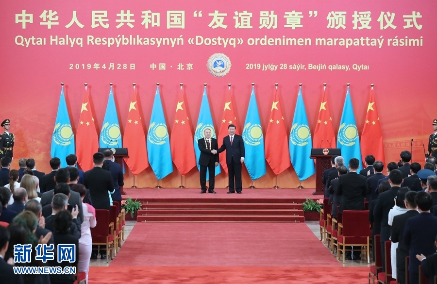 新華社北京4月28日電(記者白潔、馬巖)國家主席習近平28日在人民大會堂中央大廳為哈薩克斯坦首任總統(tǒng)納扎爾巴耶夫舉行“友誼勛章”頒授儀式。