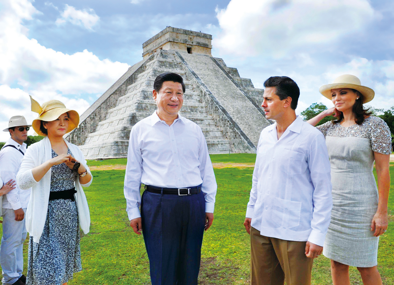2013年6月6日,為推進(jìn)中墨兩個(gè)文明古國(guó)的文化交流,國(guó)家主席習(xí)近平應(yīng)培尼亞總統(tǒng)邀請(qǐng)參觀奇琴伊察瑪雅文明遺址。 新華社記者 饒愛民/攝