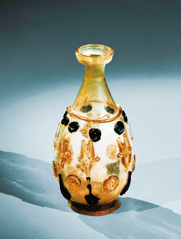 1987年,在中國(guó)陜西的法門寺,地宮中出土了20件美輪美奐的琉璃器,這是唐代傳入中國(guó)的東羅馬和伊斯蘭的琉璃器。圖為法門寺地宮中出土的盤口細(xì)頸貼塑淡黃色琉璃瓶。 法門寺博物館供圖