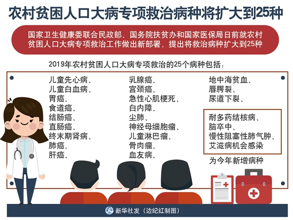 新華社北京5月14日電(記者屈婷)國家衛(wèi)生健康委聯合民政部、國務院扶貧辦和國家醫(yī)保局日前就農村貧困人口大病專項救治工作做出新部署,提出將救治病種擴大到25種。