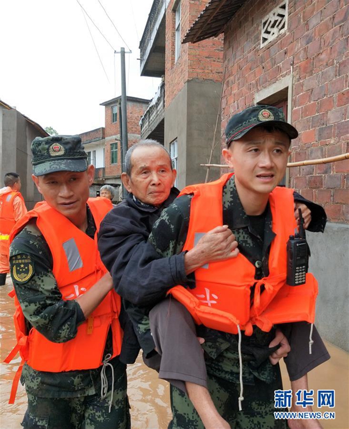 6月7日,武警江西省總隊上饒支隊官兵在玉山縣下鎮(zhèn)鎮(zhèn)白橋村轉(zhuǎn)移被洪水圍困的老人。新華社發(fā)(吳展 攝)