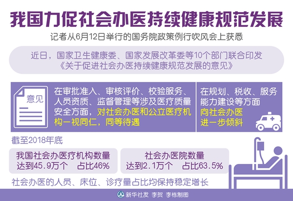 新華社北京6月12日電(記者張泉、屈婷)記者從12日舉行的國務(wù)院政策例行吹風(fēng)會上獲悉,近日,國家衛(wèi)生健康委、國家發(fā)展改革委等10個部門聯(lián)合印發(fā)《關(guān)于促進(jìn)社會辦醫(yī)持續(xù)健康規(guī)范發(fā)展的意見》,立足社會辦醫(yī)的定位和發(fā)展方向,在鞏固和加強前期工作的基礎(chǔ)上,又推出一批鼓勵支持政策。
