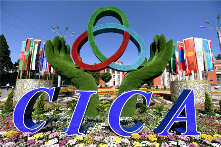 這是6月13日在塔吉克斯坦首都杜尚別拍攝的亞洲相互協作與信任措施會議標識。新華社記者 沙達提 攝