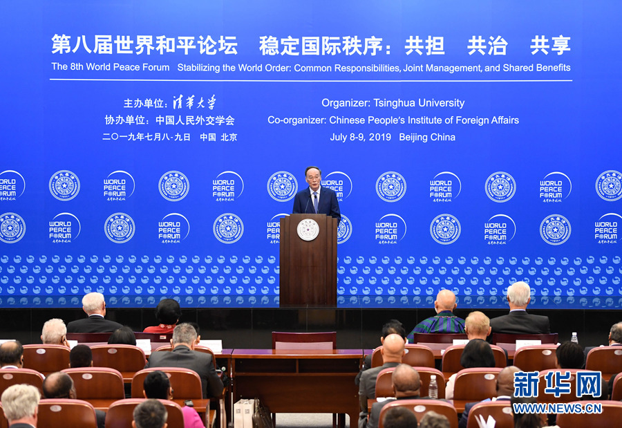 7月8日,以“穩(wěn)定國際秩序:共擔、共治、共享”為主題的第八屆世界和平論壇在清華大學舉行,國家副主席王岐山出席開幕式并致辭。 新華社記者 申宏 攝