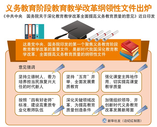 新華社北京7月8日電(記者胡浩)《中共中央 國務院關于深化教育教學改革全面提高義務教育質量的意見》近日印發。這是黨中央、國務院印發的第一個聚焦義務教育階段教育教學改革的重要文件,是新時代我國深化教育教學改革、全面提高義務教育質量的綱領性文件。