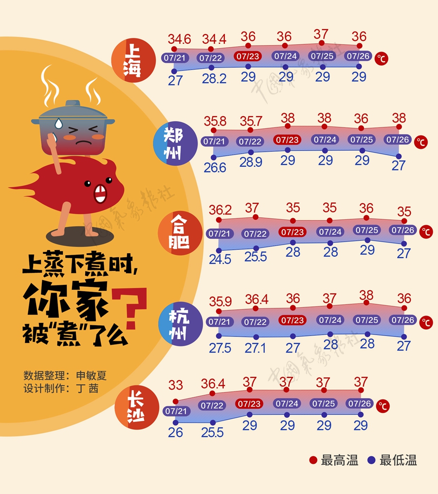 其中,鄭州、合肥、南京、上海、長沙、南昌等地不僅最高氣溫超過35℃,持續5天至7天,而且最低氣溫也在28℃、29℃,夜間炎熱絲毫沒有緩和,可謂火力十足。