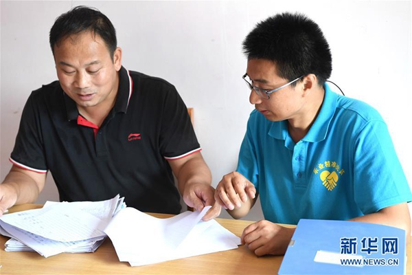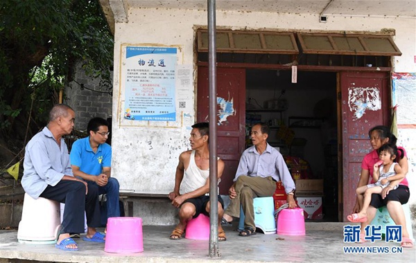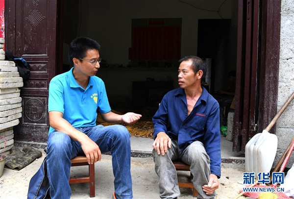 楊杰興(左)在廣西樂(lè)業(yè)縣百坭村向村民了解孩子讀幼兒園的情況(8月1日攝)。新華社記者 周華 攝