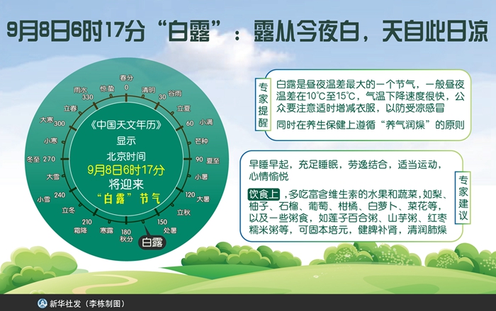 新華社天津9月6日電(記者周潤健)“憑闌久,金波漸轉,白露點蒼苔。”《中國天文年歷》顯示,北京時間9月8日6時17分將迎來“白露”節氣。專家提醒說,此時節“秋老虎”將逝去,氣溫開始下降,天氣逐漸轉涼,公眾要注意養氣潤燥。