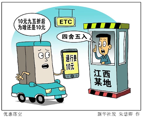 6日上午,國務院第七督查組驅(qū)車從南昌市出發(fā),來到70余公里外的共青城市。當車駛出ETC專用收費通道時,電子屏上顯示的收費金額是29元。收費站工作人員說,這段路程不走ETC通道通行費是30元。督查人員計算,30元打完九五折后應收28.5元,但被系統(tǒng)“四舍五入”收了29元。隨后,督查組又從共青城市前往德安縣,原價10元的通行費ETC折后依然收費10元,沒有享受到任何優(yōu)惠。