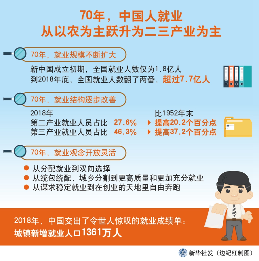 新華社北京9月24日電(記者葉昊鳴)從新中國成立之初大多數(shù)勞動(dòng)者以農(nóng)為主,到2018年第二、三產(chǎn)業(yè)就業(yè)人員占比超七成,服務(wù)業(yè)占主導(dǎo)的現(xiàn)代就業(yè)模式逐步形成,并日漸成為推動(dòng)我國經(jīng)濟(jì)社會(huì)發(fā)展的重要力量。