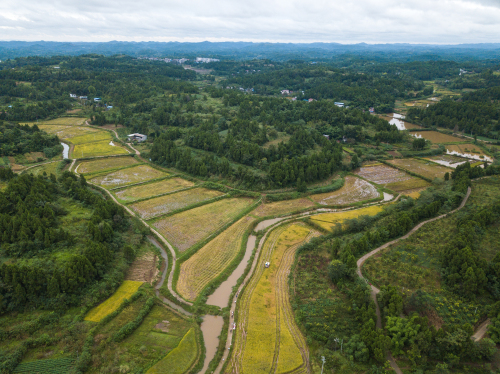 無(wú)人機(jī)拍攝的四川省樂(lè)至縣三河咀村的稻田 李昕鋒 攝