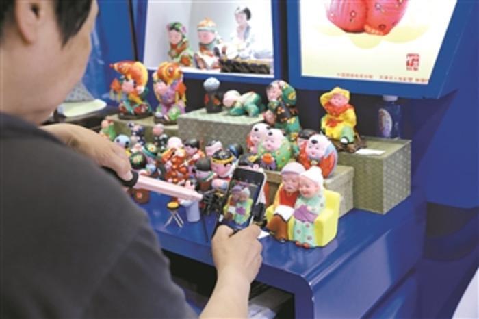 第十四屆中國北京國際文化創意產業博覽會現場,觀眾拿起手機拍攝“中國夢”泥塑創作者天津泥人張彩塑作品。本報記者 劉金夢 攝