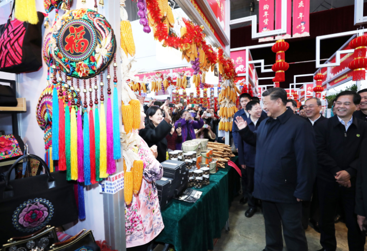 20日下午,習近平在昆明新春購物博覽會年貨街,了解春節前市場供應情況。