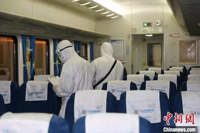 防疫人員正在對列車進行消毒。戴昊君 攝