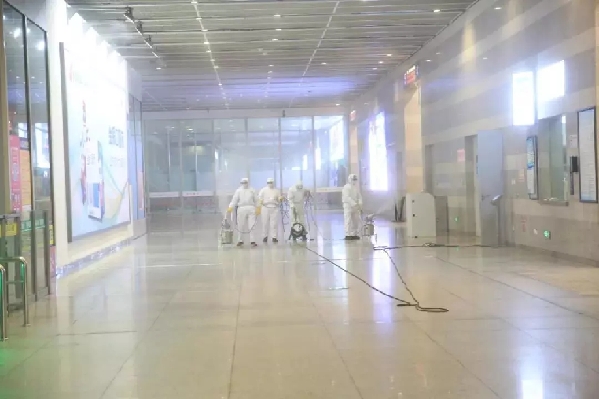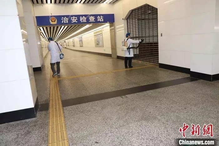 防疫人員正在對車站進行消毒。戴昊君 攝