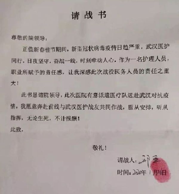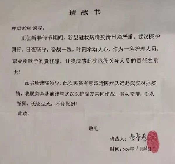 甘肅省定西市人民醫(yī)院新生兒科護(hù)士長曹愛春和護(hù)士邢亞半夜寫下請戰(zhàn)書,懇請?jiān)悍脚鷾?zhǔn)奔赴一線。落款時(shí),兩人寫了八個(gè)字:無論生死,不計(jì)報(bào)酬。(定西市人民醫(yī)院供圖)