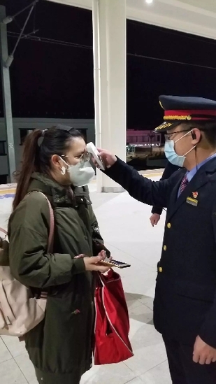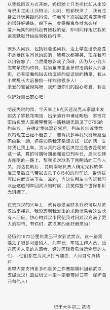 9時(shí)54分,D785次列車到達(dá)昆明南站,昆明南站的工作人員再次給她測了體溫沒問題后,立即帶她去找昆明南開往南京南的G1540次列車的列車長張峻豪。10時(shí)20分,郎冰凝坐上了G1540次列車奔向武漢。