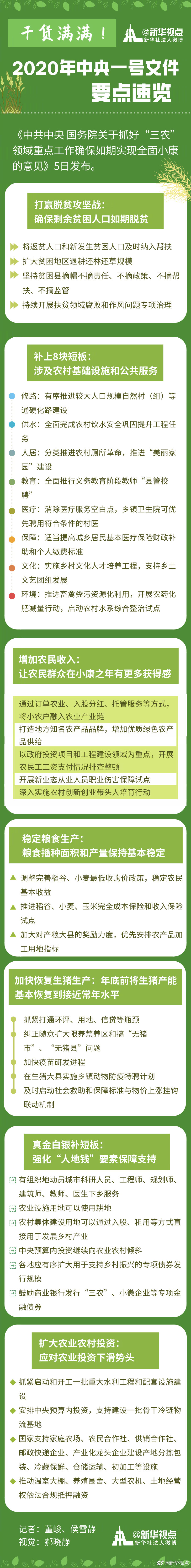 《中共中央 國務(wù)院關(guān)于抓好“三農(nóng)”領(lǐng)域重點工作確保如期實現(xiàn)全面小康的意見》5日發(fā)布。針對集中力量完成打贏脫貧攻堅戰(zhàn)和補(bǔ)上全面小康“三農(nóng)”領(lǐng)域突出短板這兩大重點任務(wù),文件有哪些干貨、硬貨? ?