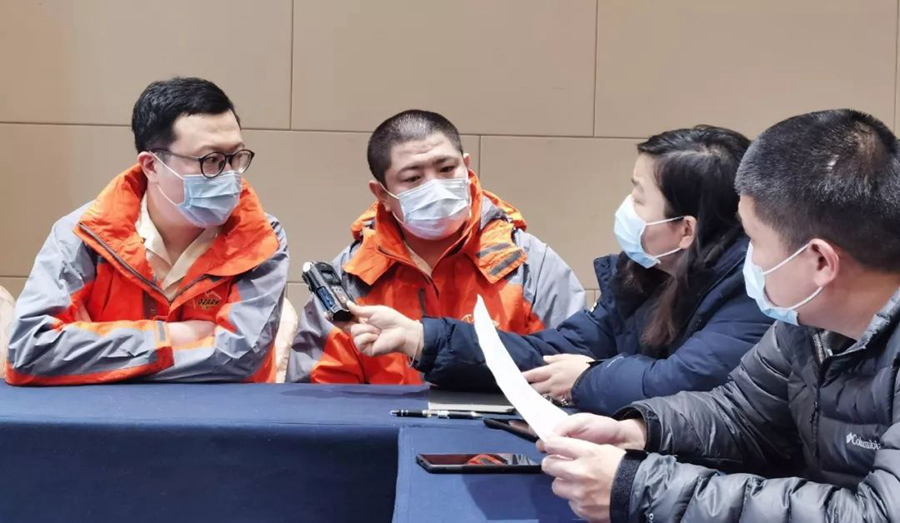 關(guān)宏奎(左二)和同事一起接受本臺(tái)記者勁清的采訪