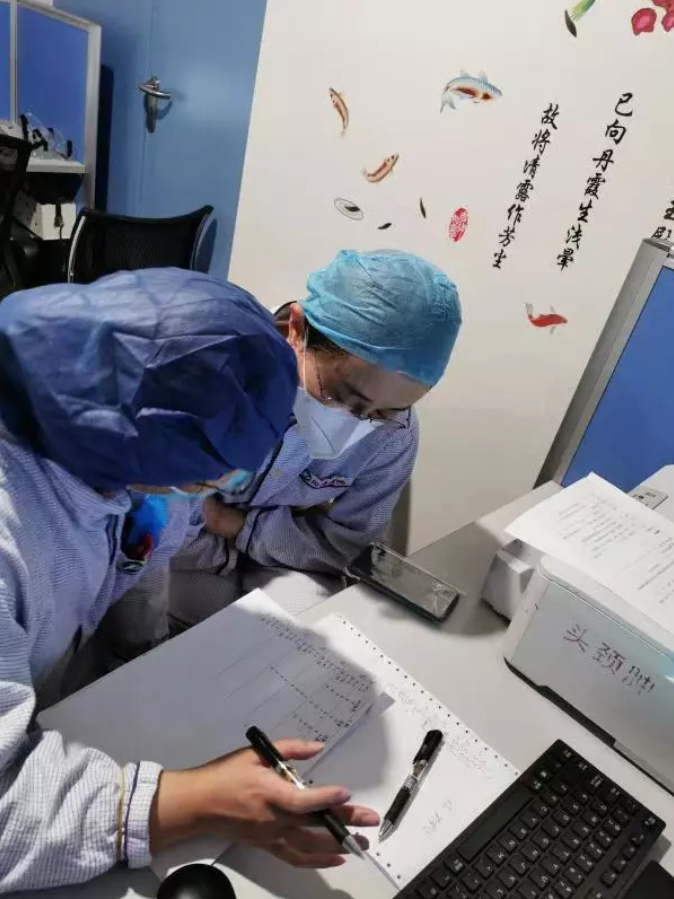 啟用危重癥新病房的第一天,姝姐上了一個“24小時白連夜班”。第一位來診的是個危重患者,姝姐主動請纓:“來,我收這個病人。”凌晨3點,到了該下班的時間,姝姐還在寫病歷,她說污染區的護士還沒換好衣服,“等她們出來,我再結束工作,我們一起離開”。而這一等又是一個小時……下午15點到21點又輪到北醫三院隊員們上崗了,她再次主動請纓參加工作,我有些擔心她的身體會吃不消,本想勸阻一下,誰知她微微一笑說:“你姝姐有啥不行的!”直到22點30,姝姐才從隔離病房出來,口罩和眼罩已經壓紅了鼻梁,衣服早已被汗水浸濕了,可她仍然面帶著微笑。