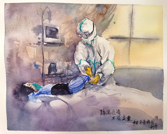 水彩畫《隔離疫情 不隔離愛》作者:中央芭蕾舞團舞美設計 劉辛