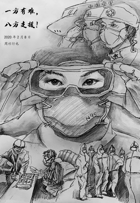 素描畫《一方有難,八方支援!》作者:中央芭蕾舞團燈光設計 周杉行也