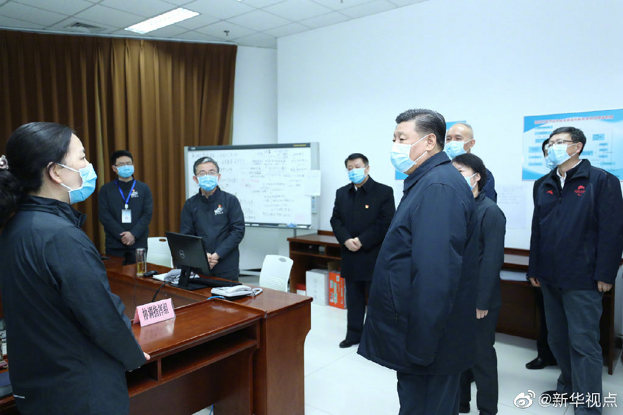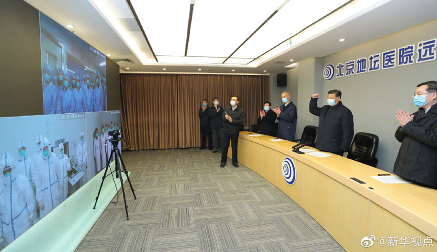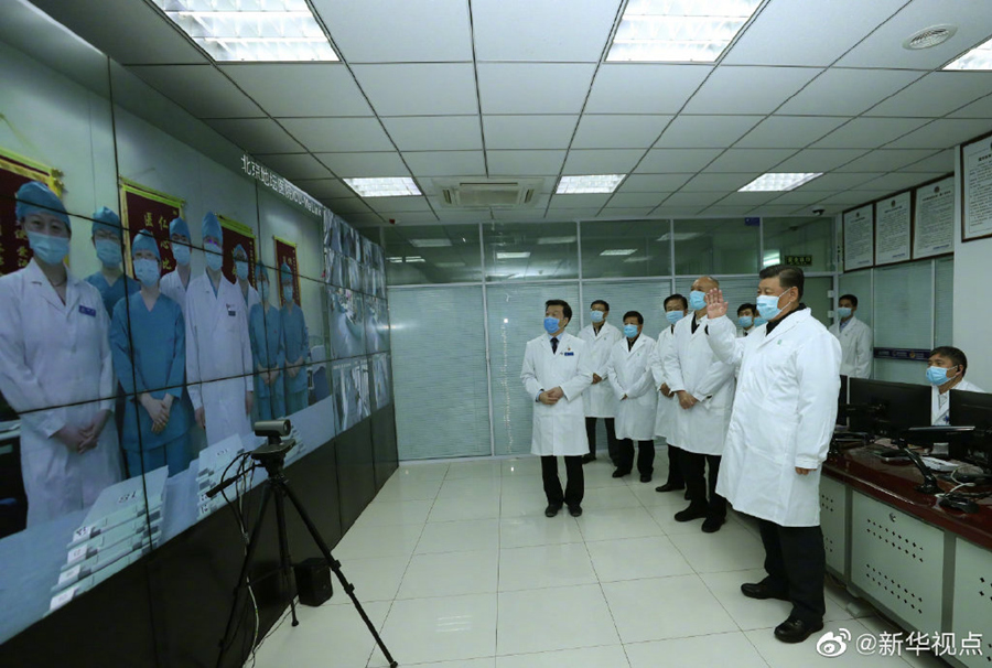 10日下午,習近平來到北京地壇醫(yī)院,察看新冠肺炎感染者住院診療情況,視頻連線武漢市重癥患者收治醫(yī)院,聽取中央指導組、湖北指揮部有關情況匯報,慰問奮戰(zhàn)在一線的醫(yī)務工作者。隨后,習近平前往朝陽區(qū)疾病預防控制中心,了解朝陽區(qū)開展應急處置、流行病學調(diào)查、篩查報告和北京市疫情防控工作情況。(文字記者張曉松 攝影記者鞠鵬、謝環(huán)馳、劉彬)?
