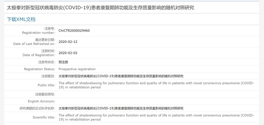 近日,記者用“新型冠狀病毒肺炎”等關(guān)鍵詞,在中國(guó)臨床試驗(yàn)注冊(cè)中心查詢(xún)發(fā)現(xiàn),截至2月12日已有60項(xiàng)符合檢索條件的試驗(yàn)。這些臨床試驗(yàn)內(nèi)容非常廣泛,既包括多種西藥、干細(xì)胞、中藥、重要注射劑,還包括社區(qū)干預(yù)療法等。令記者沒(méi)想到的是,其中竟然還有一項(xiàng)預(yù)注冊(cè)方案,準(zhǔn)備研究太極拳對(duì)患者康復(fù)期肺功能及生存質(zhì)量的影響。