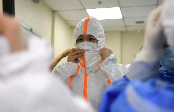 武漢協和醫院(西院),湘雅醫院感染病科醫生在穿防護衣。經濟日報記者高興貴攝