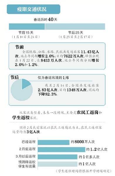 從客流類型看,未來一段時間,主要是農民工返崗客流和學生返校客流,公務商務客流較少、旅游客流很少。預計2月底前客流以農民工返崗流為主,2月底前將迎來學生返校客流。