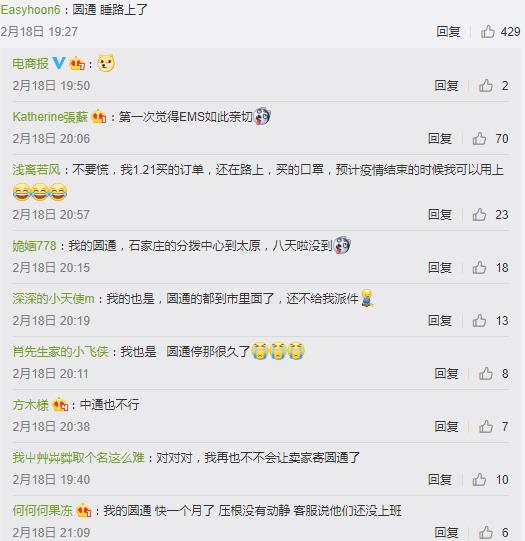 網(wǎng)友“滿(mǎn)杯甜酒椰”發(fā)布微博稱(chēng),“我十天沒(méi)動(dòng)的韻達(dá)是不是可以更新一下物流惹”;網(wǎng)友“啵霸兔兔果茶”說(shuō),“圓通快遞怕是消失了,送個(gè)東西幾天不動(dòng)一下”;網(wǎng)友“啊啊啊喵在等待”則調(diào)侃,“等中通快遞把我的口罩寄到了,疫情也快結(jié)束了吧”。