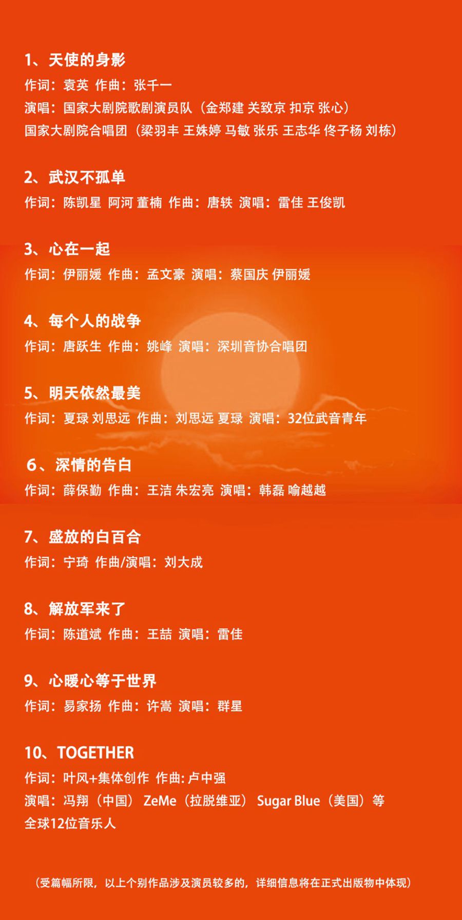 目前,第二批入選作品即將與聽眾見面。此次精選的10首抗疫優秀主題歌曲,凝結社會各界的創作力量,包括各地音樂工作者、音樂院校、藝術院團、專業音樂公司等,主要表現疫情防控工作進入關鍵階段以來,全國上下一盤棋,眾志成城決戰決勝武漢抗疫保衛戰的堅定決心和必勝信念。