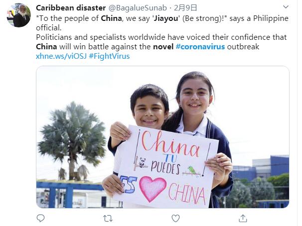 推特用戶Caribbean disaster說:一名菲律賓官員表示,想要對(duì)中國人民說,你們加油。世界各地的政治家和專家紛紛表示,對(duì)中國戰(zhàn)勝新冠疫情很有信心。(作者: 嚴(yán)玉潔 資料來源:新華社、央視網(wǎng)、人民網(wǎng)、國際在線等)