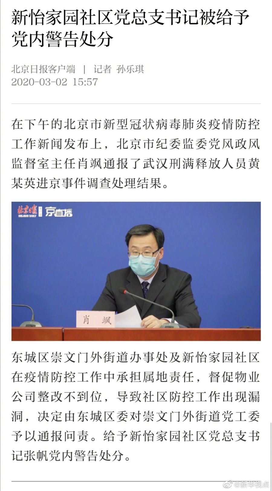 北京新怡家園社區(qū)黨總支書記被給予黨內(nèi)警告處分-新華網(wǎng)