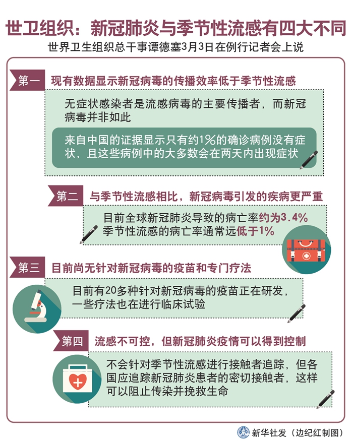世界衛生組織總干事譚德塞3日在例行記者會上說,世衛組織正在加深對新冠肺炎的認識,并發現它與季節性流感存在4個重要區別。
