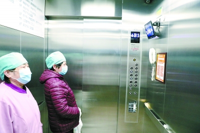 昨天,在海淀醫(yī)院,醫(yī)務(wù)人員搭乘語音電梯。 記者 饒強(qiáng)攝