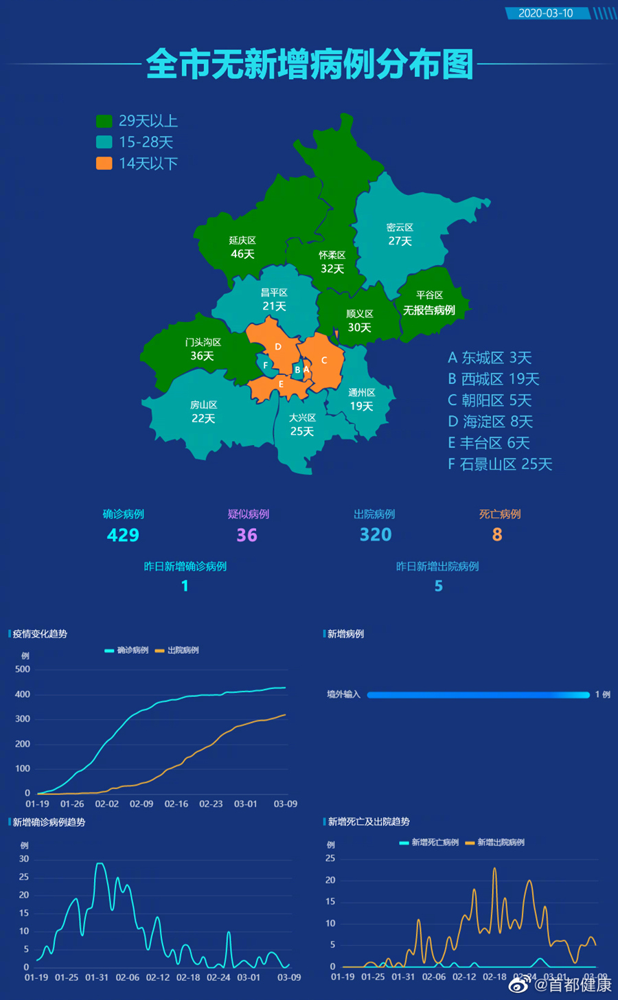 截至3月9日24時,累計確診病例429例,治愈出院病例320例,死亡病例8例。現(xiàn)有疑似病例36例。累計確定密切接觸者3650人,其中467人尚在隔離醫(yī)學觀察中。確診病例中東城區(qū)14例、西城區(qū)53例、朝陽區(qū)72例、海淀區(qū)63例、豐臺區(qū)43例、石景山區(qū)14例、門頭溝3例、房山區(qū)16例、通州區(qū)19例、順義區(qū)10例、昌平區(qū)29例、大興區(qū)39例、懷柔區(qū)7例、密云區(qū)7例、延慶區(qū)1例,平谷區(qū)尚未有病例,外地來京病例25例,境外輸入病例14例。