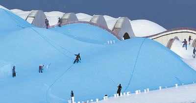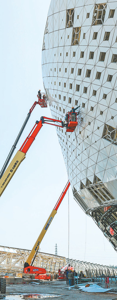 3月15日,第十八屆世界中學生運動會主會場福建晉江市第二體育中心各個場館及室外工程均已全部復工。圖為工人在進行主場館外立面施工。邵玉姿 董嚴軍攝影報道