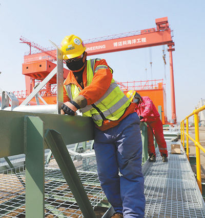 3月11日,在天津港大沽口港區,工人正在加緊組裝海上油氣工程模塊。龔相娟 李宇光攝影報道