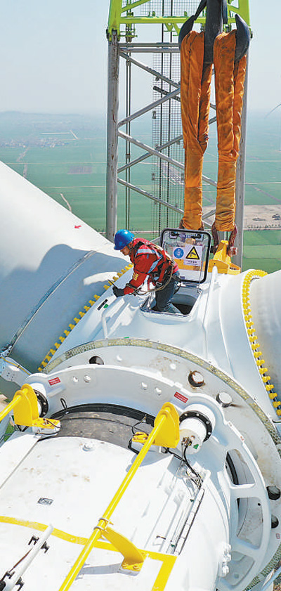 3月15日,在安徽省亳州市蒙城縣,華能風電項目復工后的第七臺風機順利吊裝。胡衛國攝(影像中國)
