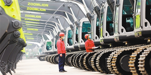 位于陜西省渭南高新區(qū)的中聯(lián)重科渭南工業(yè)園內(nèi),檢驗人員對即將出廠的挖掘機(jī)檢查驗收。崔正博攝(中經(jīng)視覺)