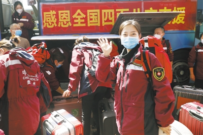 3月17日,支援湖北的部分貴州醫(yī)療隊(duì)員和湖南醫(yī)療隊(duì)員從武漢火車站乘坐高鐵離開。圖為貴州醫(yī)療隊(duì)員向歡送的人們揮手致意。新華社記者 沈伯韓攝