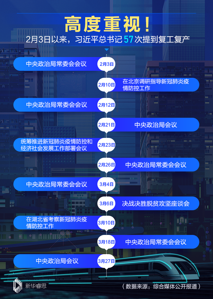 數據顯示,自2月3日以來,習近平在不同場合共提到了復工復產57次,足見總書記對復工復產工作的重視和關注。
