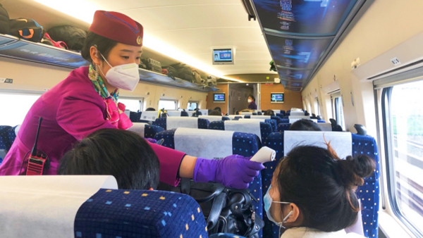 4、測溫:專列內(nèi)幾乎滿座,餐飲等服務照常進行,乘務員定時為乘客測量體溫。