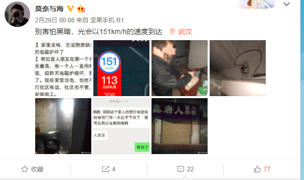 2月28日晚上10點多,樓威辰收到一項特殊的求助。一個獨居盲人張磊(化名)因電磁爐燒壞導(dǎo)致跳閘停電,無法做飯,打電話給社區(qū),社區(qū)說暫時沒法安排電工,只好通過朋友在網(wǎng)上求助。