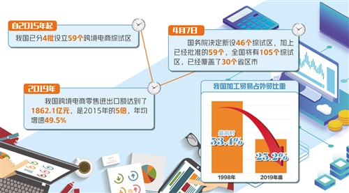 2019年,我國跨境電商零售進出口額達到了1862.1億元,是2015年的5倍,年均增速49.5%,綜試區在外貿發展中的作用也日益凸顯。