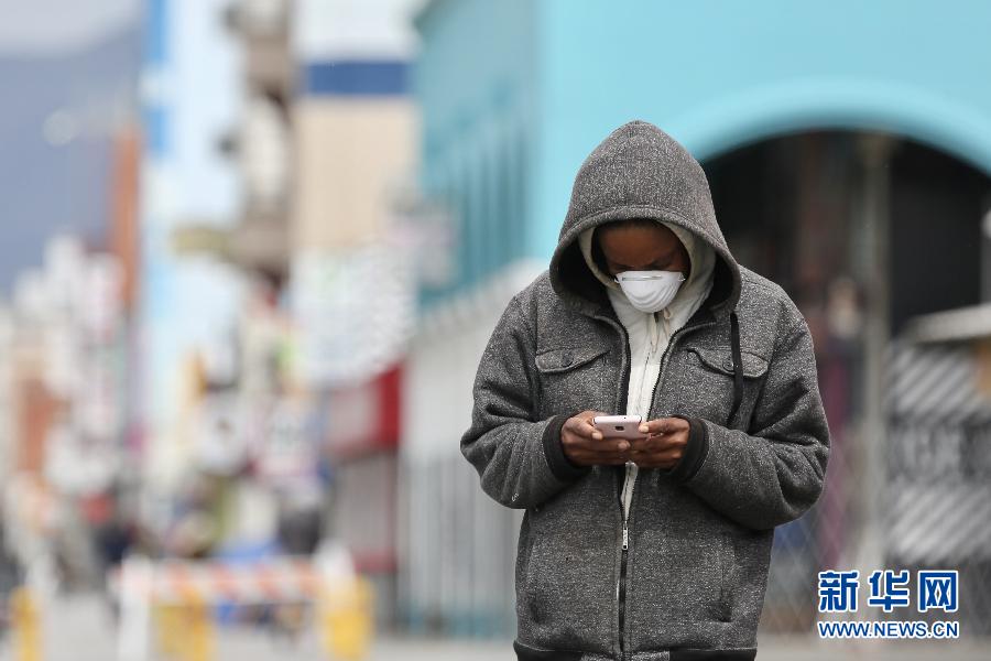 4月10日,一名戴口罩的行人在美國洛杉磯威尼斯海灘看手機。 為減緩新冠病毒的傳播,洛杉磯市長7日下令,民眾在公共營業場所要戴口罩或用織物遮擋住臉,這一行政令于2020年4月10日生效。 新華社發