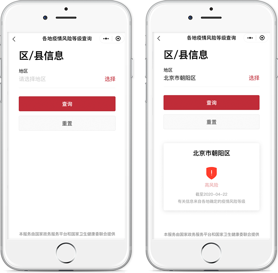 出行前,你可以用此服務查詢你所在地和目的地的疫情風險等級。該服務根據國家衛生健康委數據進行動態更新,只需簡單輸入地區即可查詢。