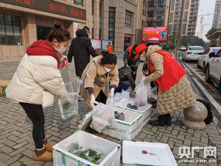 楓樺葦岸社區第一次開展保供聯盟,劉宜和志愿者一起分裝蔬菜。(央廣網發 通訊員供圖)