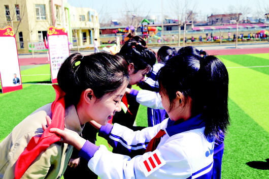 湯池鎮(zhèn)中心小學(xué)學(xué)生為高潘(左)系紅領(lǐng)巾。(受訪者供圖)